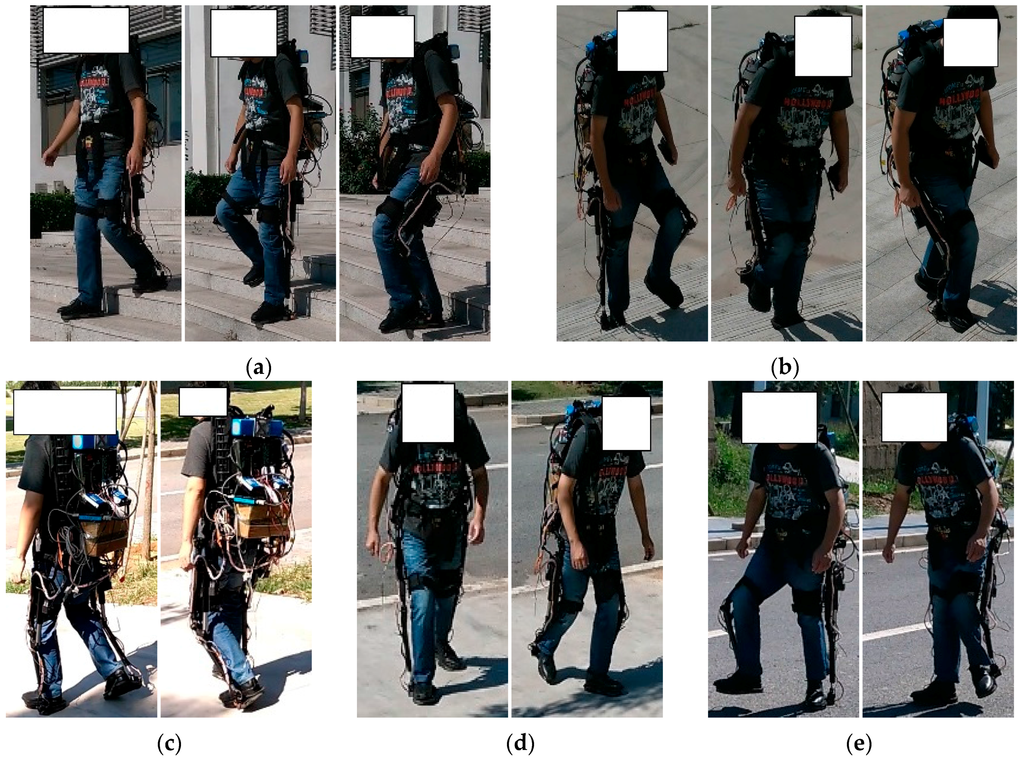 To evaluate the performance of the proposed method, three healthy (male) subjects participated in the experiment, which is shown in Figure 12. Those three subjects have an average height of 1.70 ± 0.25 m, an average weight of 60 ± 5.6 kg and an average age of 25 ± 1.5 years old. Before the experiments, the sensor system should be checked to make sure all the sensors work well. Then the subjects wear the exoskeleton without actuation and walk on different terrains. The PC will acquire and save the observations of the foot pressure sensors and the AHRS. Before the training dataset was collected, the actuation system on the knee joint was removed from the exoskeleton. Those three subjects were required to walk on the different terrains. Since the transition among those locomotion modes started from the level walking and ended on the floor, e.g., in the case of stair ascent, the wearer walked on the floor initially, performed stairs walking and stopped on the floor finally.