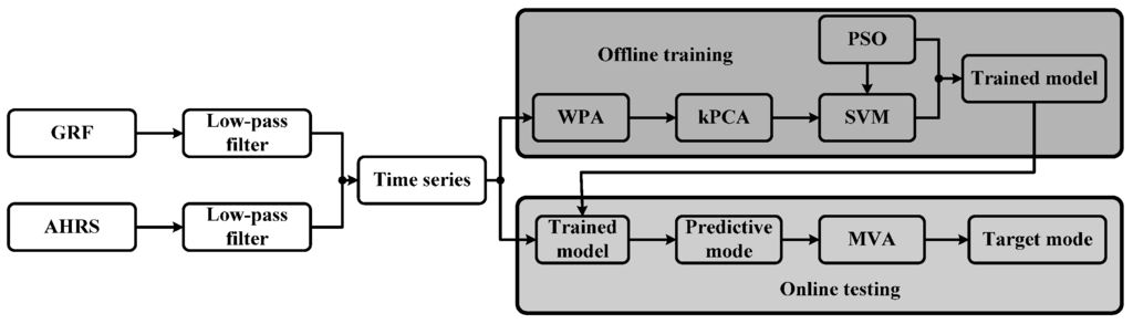 Block diagram of the proposed method. GRF signals and AHRS signals are used to obtain the elements of the time series. The GRFs signals in the swing phase are ignored since it does not change. The trained SVM is obtained offline in MATLAB and the online testing is conducted in Visual Studio.
