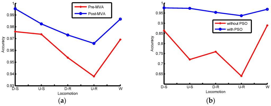 The online identification accuracy comparisons for several locomotion modes: (a) comparison between pre-MVA and post-MVA under PSO; (b) Comparison between without-PSO and with-PSO under MVA.