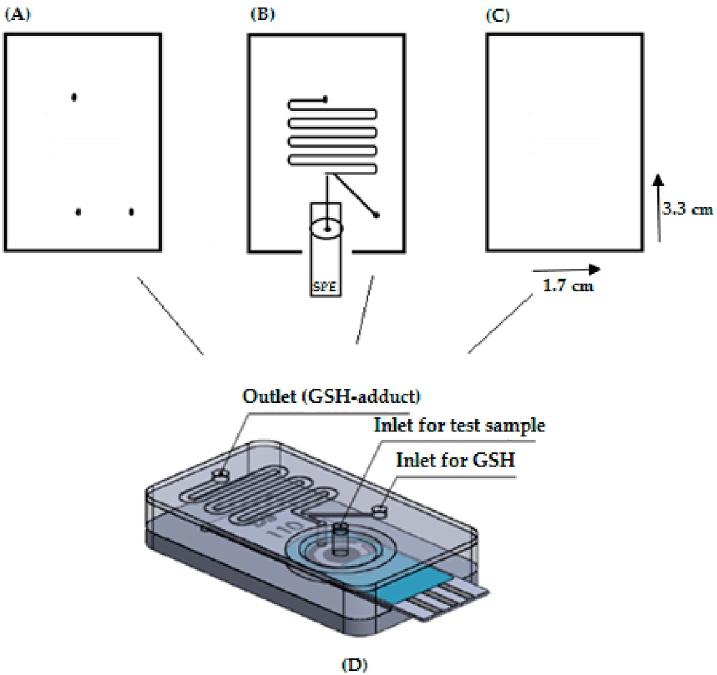 An SPE was integrated with a serpentine reaction channel into a polymeric chip for monitoring phase II metabolism. The working principle involved the electrochemical generation of the phase I intermediates within the SPE cell and their subsequent conjugation with GSH in a serpentine reaction channel.