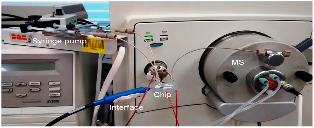 Online coupling of chip with electrospray ionization/mass spectrometry (ESI/MS).