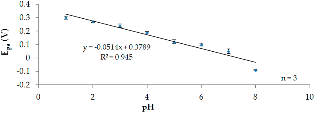 A linear relationship was obtained between the anode potential (Epa) and pH, suggesting the participation of protons during the electrochemical process (Figure 5). The anode potential shifted to more negative values as pH increased. The obtained slope 0.0514 V·pH−1 was close to the Nernestian slope of 0.059 V·pH−1 [24], implying the involvement of the same number of protons and electrons.