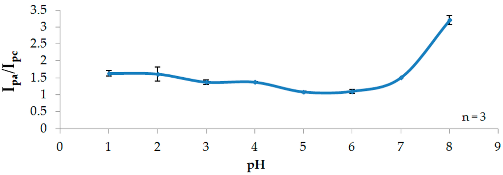 A peak current ratio (Ipa/Ipc) close to unity [25] is considered as a criterion of product stability. The anode (Ipa) and cathode (Ipc) currents have the same magnitude since the electrogenerated intermediate is not participating in further reactions. As shown in Figure 6, the product was stable over acidic conditions. The highest stability was obtained at pH 5 with an Ipa/Ipc of 1.08. In more alkaline conditions, the Ipa/Ipc started to increase, suggesting instability and further reactions with molecules in solutions. At pH 8 the greatest instability was seen with an Ipa/Ipc of 3.2.