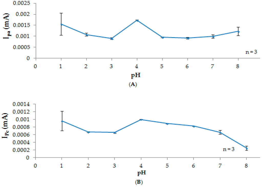 The concentration of the electrogenerated product is directly proportional to the obtained current [26]. Herein, the highest signals for both Ipa and Ipc were observed at pH 4 (Figure 7). For pH values of 1–3 and 5–8, signals were low, implying less product formation. The obtained peak currents were in good agreement with the stability studies since at pH 8 the product was unstable and lower currents were generated.