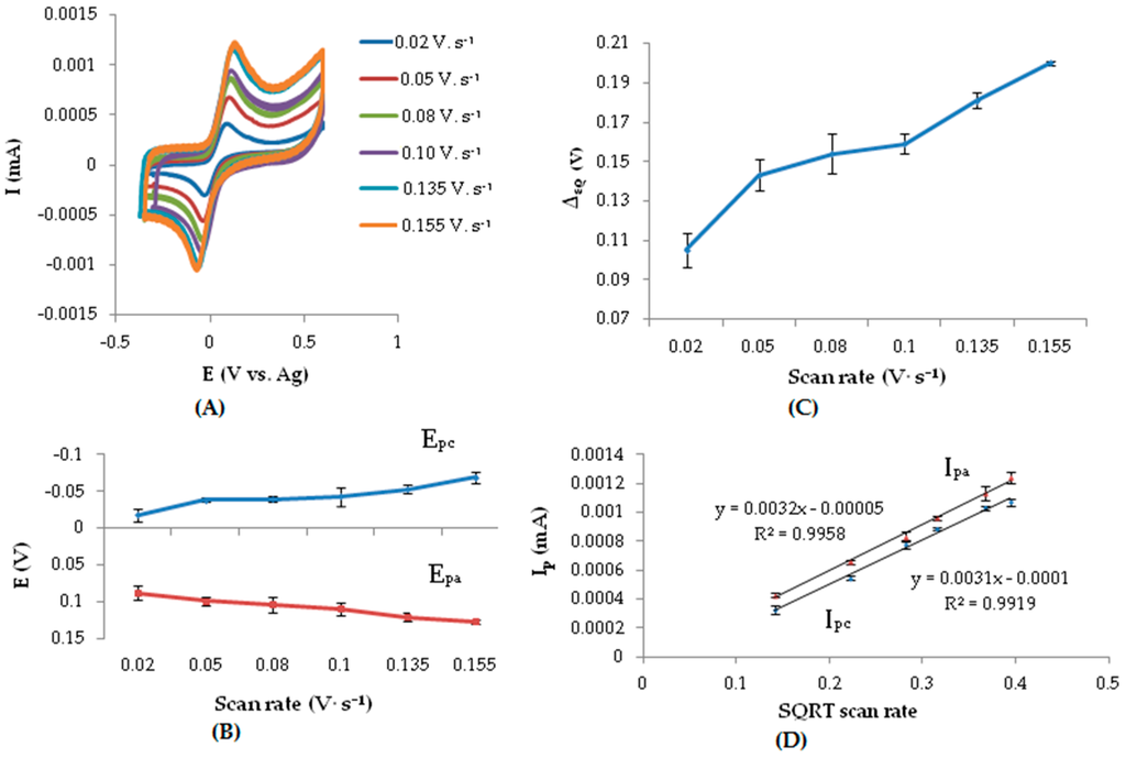 Useful information regarding the electrochemical reaction mechanisms can be acquired from the potential scan rate. Therefore, the electrochemical response of DOPA (2.5 × 10−5 M) in 0.1 M phosphate buffer (pH 5) was investigated at different scan rates from 0.02 V·s−1 to 0.155 V·s−1 by cyclic voltammetry (Figure 8A). The results illustrated quasi-reversible kinetics [27,28]. Epa and Epc shifted to more positive and more negative values, respectively (Figure 8B). Also, the Δερ increased with the increase in scan rate (Figure 8C) while a linear relationship was obtained between the Ip and square root (SQRT) of scan rate (Figure 8D).