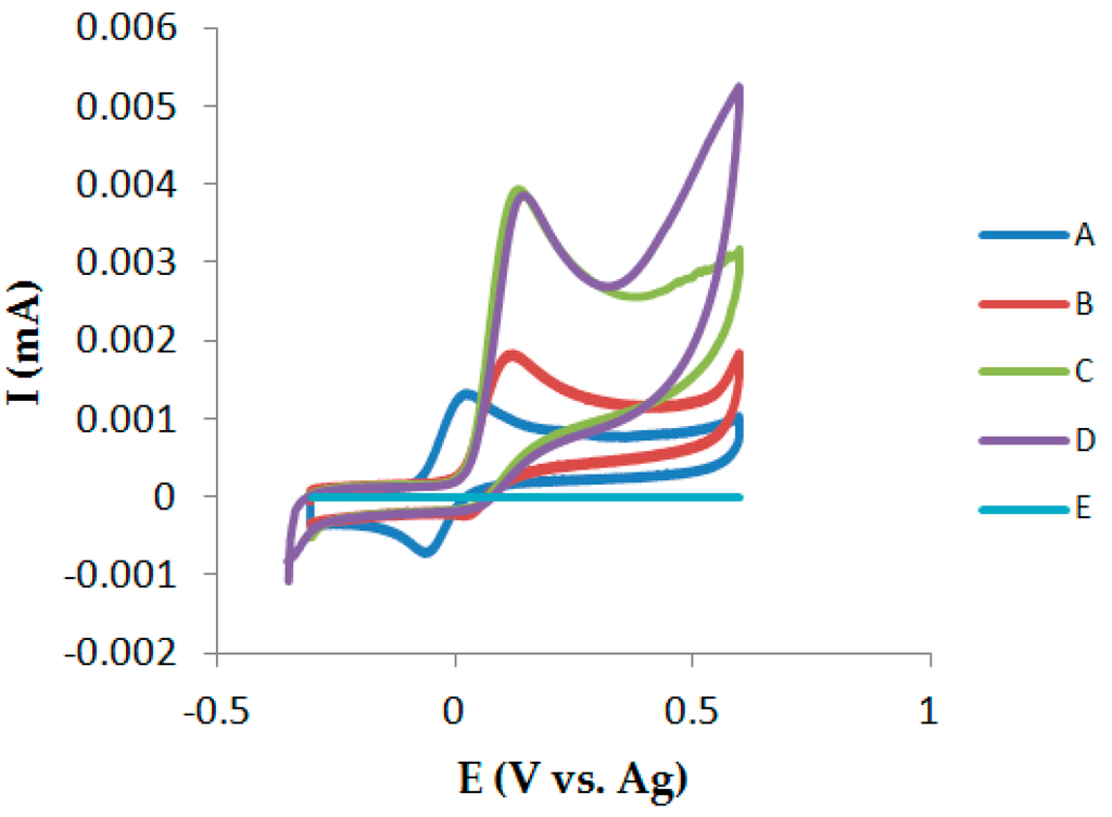 Cyclic voltammetry of DOPA (2.5 × 10−5 M) as a function of GSH addition. (A) DOPA (2.5 × 10−5 M). (B) In the presence of 5 × 10−5 M GSH. (C) In the presence of 1.24 × 10−5 M GSH. (D) In the presence of 2.5 × 10−4 M GSH. (E) GSH (5 × 10−5 M).
