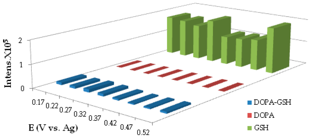 The oxidative potential was optimized from 0.17 V to 0.52 V, over a mass transport limit with increasing steps of 0.05 V, as shown in Figure 10. The selection of potentials was based on the obtained voltammograms in Figure 9, in the presence of 5 × 10−5 M of GSH. The DOPA-GSH adduct (m/z 459) was detectable at all potentials and the parent compound was depleted. The optimum potential was found to be 0.27 V, since this is when higher yields were obtained, as indicated by the intensities from MS.