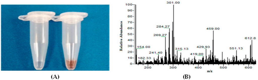 (A) Colour change after electrolysis; (B) Mass spectrum of DOPA electrochemical metabolism at 0.27 V.