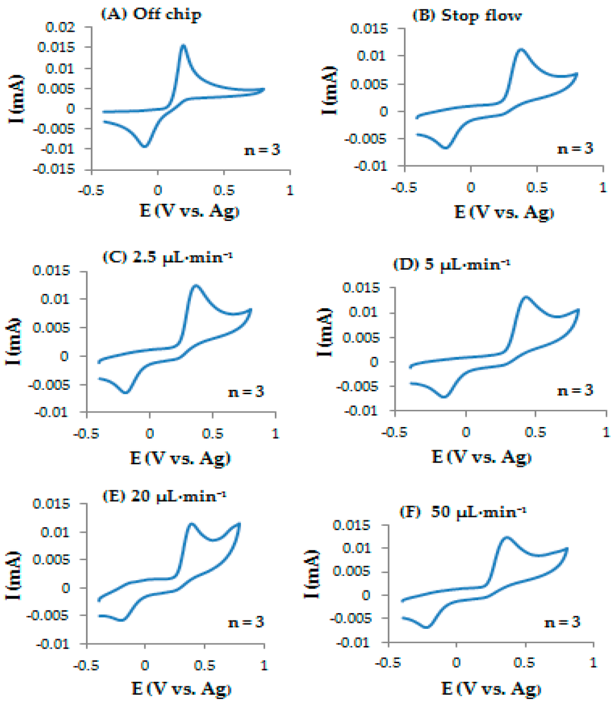 During validation studies, cyclic voltammetry was used to determine the potential range for CPE. Cyclic voltammograms of APAP (1 × 10−3 M) in 0.1 M ammonium acetate were recorded on the chip at stop flow conditions and at various flow rates from 2.5 µL·min−1 to 50 µL·min−1. As shown in Figure 12, a well-defined quasi-reversible pair was obtained, illustrating the capability of chip to determine a potential range. Shifts in potentials have been obtained mainly in higher flow rates due to an enhanced material adsorption.