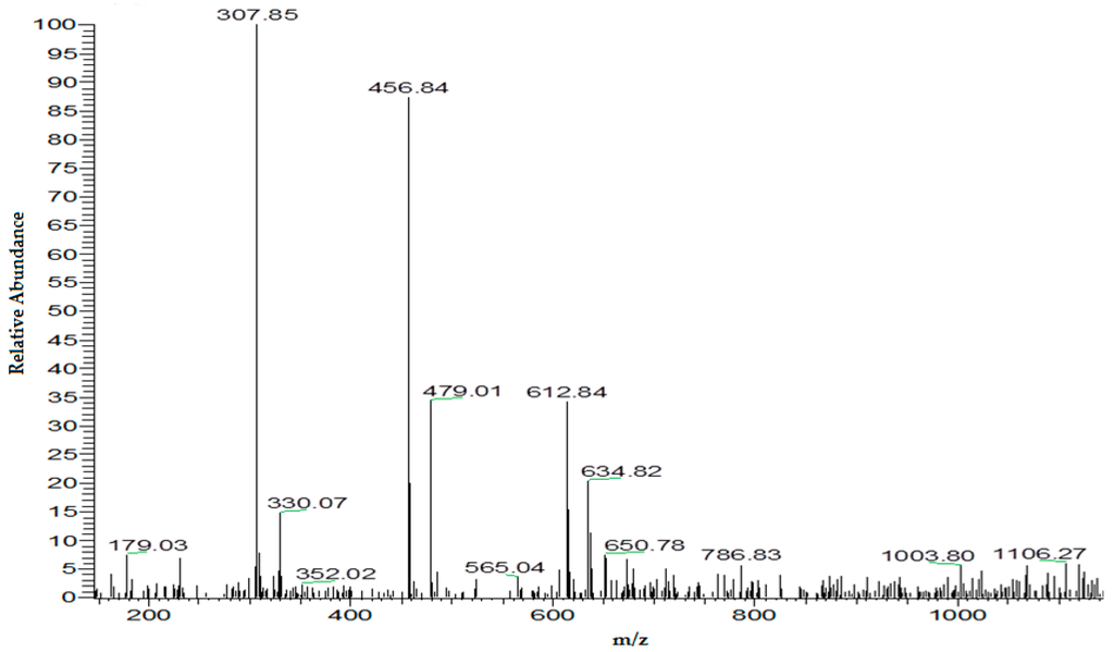 The maximum DOPA-GSH adduct formation was obtained at 0.37 V. However, the optimum potential on the bare SPE was found to be at 0.27 V. This observation is due to the surface chemistry having changed over flow conditions, leading to strong adsorption phenomena. The potential difference did not limit the functionality of the chip, since the DOPA-GSH was successfully generated and the aim of monitoring the phase II metabolism of DOPA was fulfilled. The obtained ion intensities for the DOPA-GSH adduct were increased from 0.17 V to 0.37 V, and then decreased. Considering that SPEs have a limited potential application up to 1 V, as the potentials were approaching the potential limit, the functionality and the electrochemical stability of the chip gradually started to decline. Additionally, the catalytic product of GSSG was also obtained as in the bare SPE; the spectra at the optimized potential of 0.37 V is shown in Figure 16. The ion intensities for the microfluidic device were lower when compared with earlier investigations on bare SPEs, due to the continuous sample dilution in a serpentine channel as well as adsorption effects.