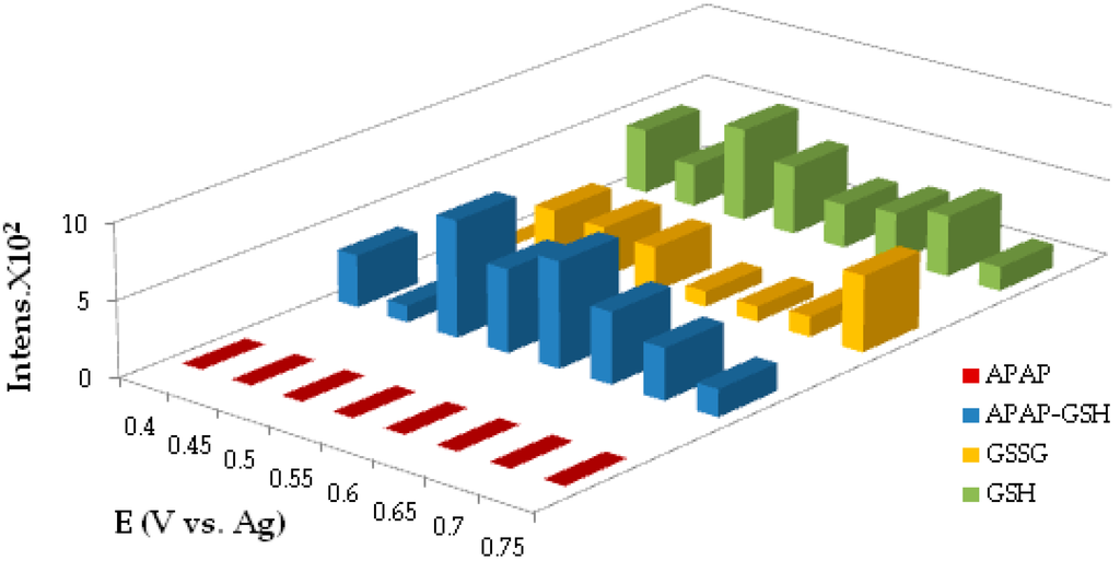 CPE in the potential range of 0.4 V to 0.75 V was recorded, in 0.05 V steps to determine the optimum potential for APAP-GSH formation. The conditions applied were the same as in offline coupling. The oxidation potential was 0.35 V, as determined by cyclic voltammetry; however, the investigated potential range was at least 0.05 V higher to ensure minimum interference from kinetics. At the oxidative peak the electrochemical reaction is not completed yet and a strong competition is created between the electron transfer and mass transport. Thus, maximum metabolite yields can be obtained at higher potentials, where the electrochemical reaction leads gradually to depletion and the system is dominated by mass transport. As seen in Figure 14, the APAP-GSH adducts and GSSG were formed, suggesting the capability of the chip to mimic two metabolic pathways, simultaneously over flow conditions. The optimum potential for the APAP-GSH adducts was found to be 0.5 V.