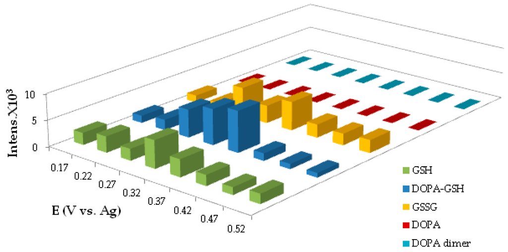 Experiments on an SPE confirmed the capability of the particular sensors to mimic multiple DOPA metabolites. The great instability of dopaminoquinone at pH 7.4 permitted the generation of leucodopaminochrome. For this reason, the pH of DOPA solution was decreased to pH 7, aiming for the total conversion of dopaminoquine into the required phase II adduct. In addition, the time of electrolysis was also reduced significantly to 6.4 min in order to prevent the dominance of leucodopaminochrome over GSH-adduct. As seen in Figure 15, the DOPA-GSH adduct (m/z 459) was successfully formed at all potentials and the generation of the phase I dimer was avoided.