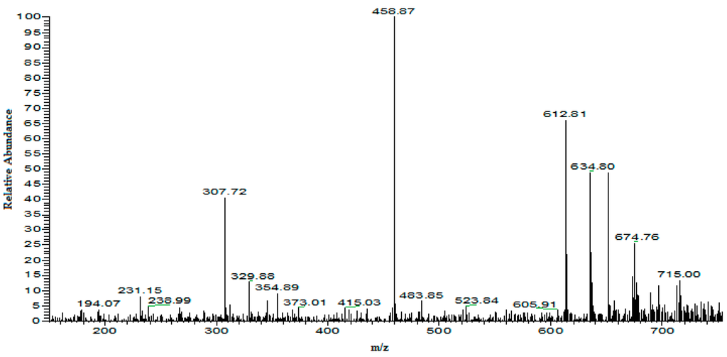The functionality of the chip in generating phase II GSH-adducts was investigated offline, using APAP as a drug probe. APAP (2.5 × 10−5 M) in 0.1 M ammonium acetate (pH 7.4) was infused into the surface of SPE and electrolysed for 6.4 min, at 0.5 V. The potential was not optimized; however, it was operated over a mass transport limit, since it was 0.1 V higher than the obtained oxidative peak in cyclic voltammetry. Subsequently, the effluent was collected and analysed by ESI/MS. The APAP-GSH adduct (m/z 456.84) was generated successfully, as seen in Figure 13, confirming the complete mimicry of the phase I (dehydrogenation) and phase II (GSH conjugation) reactions.