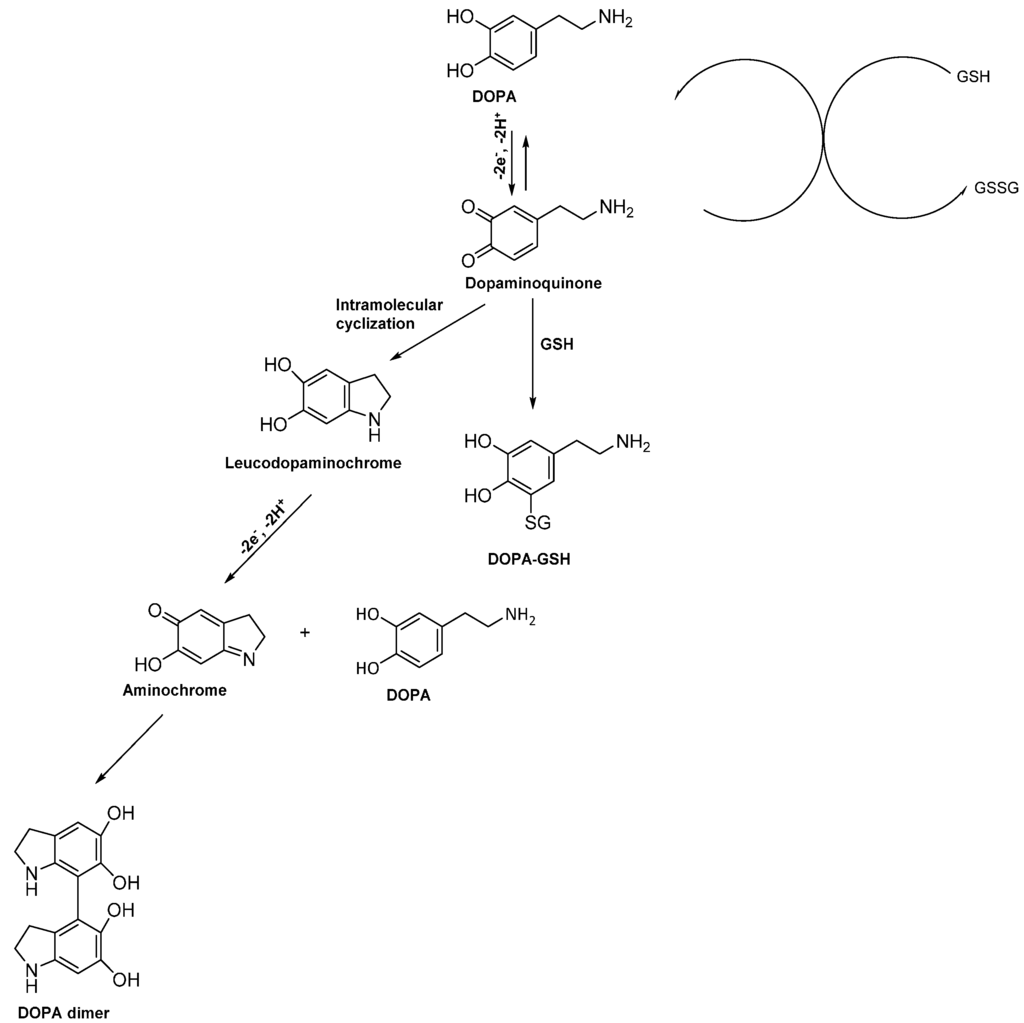 - Monoz, P.; Melendez, C.; Paris, I.; Sequra-Aquilar, J. Molecular and neurochemical mechanism dopamine oxidation to 0-quinone in Parkinson disease pathogenesis. In Toxicity and Autophage in Neurodegenerative Disorders; Springer: Basel, Switzerland, 2015; pp. 205–223. [Google Scholar]