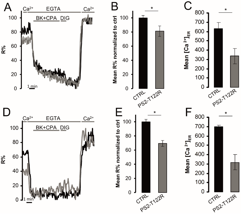 ER Ca2+ content variations upon PS2-T122R cell expression. The protocol described in Figure 1D has been applied to BHK cells co-expressing either D1ER (A–C) or D4ER (D–F) and PS2-T122R (grey traces) or the void vector (black traces), as controls; (A,D) representative traces are shown and represent R% variations upon different additions; (B,E) histograms show basal mean R% normalized to those obtained in void vector-transfected controls, in BHK cells expressing the D1ER (B) or D4ER (E) probe (mean ± s.e.m., N ≥ 16 cells for each condition); and (C,F) the conversion of calculated R% values in [Ca2+], measured using the D1ER (C) or D4ER (F) probe (mean ± s.e.m.; N ≥ 33). * = p < 0.05, unpaired Student’s t test.