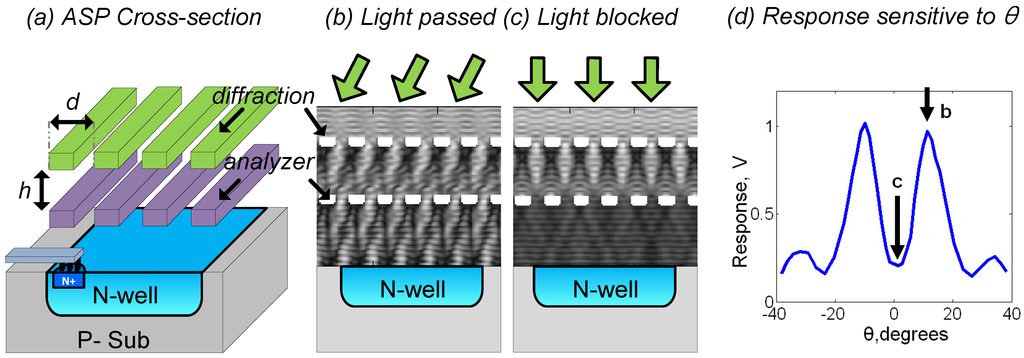 (a) Structure of simple angle sensitive pixel (ASP) [17] showing metal gratings and photodiode, grating pitch, d is order 1 µm, while vertical separation, h is order 3 µm, (b,c) finite-difference time-domain (FDTD) simulation of field intensity in response to incident plane waves of light: (b) diffraction pattern from top grating aligns with gaps in bottom grating, light passes, (c) pattern aligns with bars, light is blocked. (d) simulated intensity at detector as angle is swept. FDTD simulation is performed using MATLAB. Inter connect metal gratings (Al) is modeled as perfect electrical conductor (PEC) and the inter dielectric layer () is assumed lossless. The incident angle of the plane wave are swept.