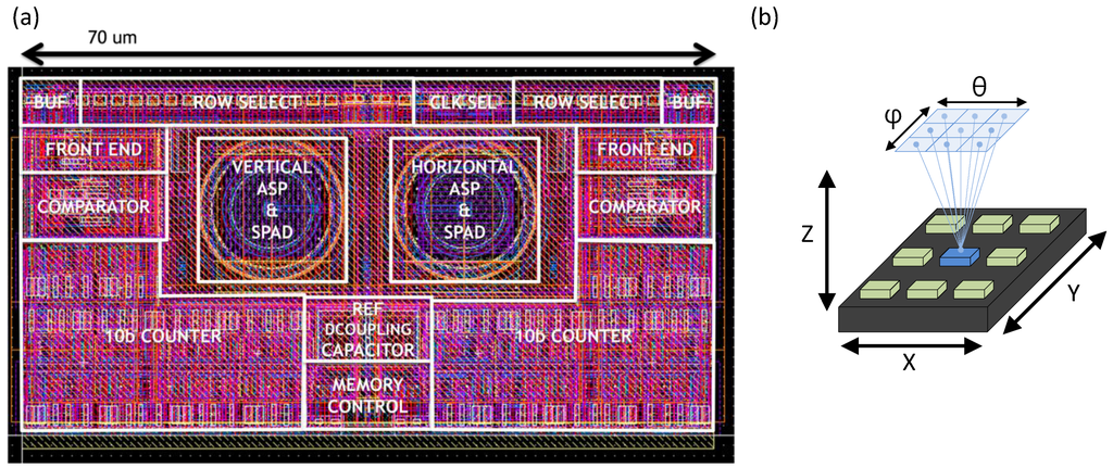 (a) Layout of two (θ and φ sensitive) A-SPAD pixels. (b) illustration of θ and φ.