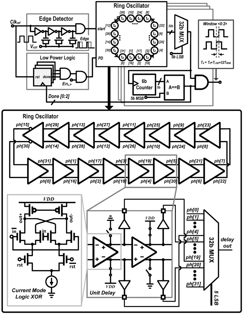 Figure 7 shows the schematic of the DTC used in this work. For minimal area and optimal power efficiency, the open-loop delay-line utilizes a ring oscillator instead of a long single line or a binary weighted programmable delay. For a synchronous open-loop operation, a single reference clock is provided from off-chip. Both positive and negative edges of the reference clock are extracted by positive/negative edge detector which initiates a positive/negative edge ring oscillator whose output is connected to three delay lines to set the relative timing between the excitation pulse and the two time-gates for rolling shutter operation. Each delay line has a coarse control (5-MSBs) that selects the number of cycles around the oscillator. The oscillator consist of 16 differential delay units, and nodes between each delay unit are connected to a thermometer-coded multiplexer which feeds each counter to provide 5 LSBs of finer control. Each delay unit is a current mode differential exclusive or (XOR) logic gate whose tail current can be adjusted to control the LSB delay (<80 ps). To counter the effects of changing the tail current, the p-FET biasing is maintained by an off-chip negative feedback loop. This structure allows flexible and accurate control of both duration and delay of the detection window relative to the reference. Furthermore, to conserve power, it is possible to power down the ring oscillator after all three time-gates are generated by putting it in a low power () mode.