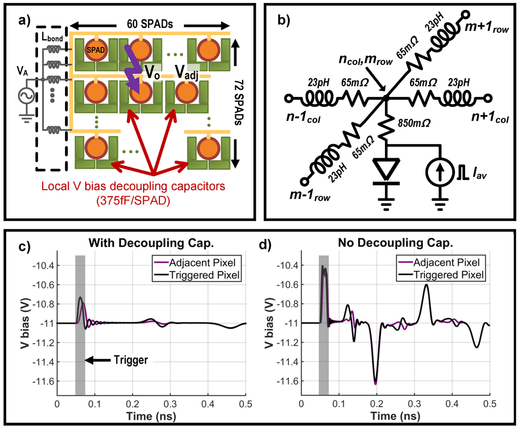 (a) Schematic of SPAD reverse bias network with local decoupling capacitors, (b) SPAD bias network impedance model. (c) Simulated SPAD reverse bias voltage with decoupling capacitor (d) Simulated SPAD reverse bias voltage without decoupling capacitors where red and black lines depict avalanche pixel and neighboring pixel respectively.
