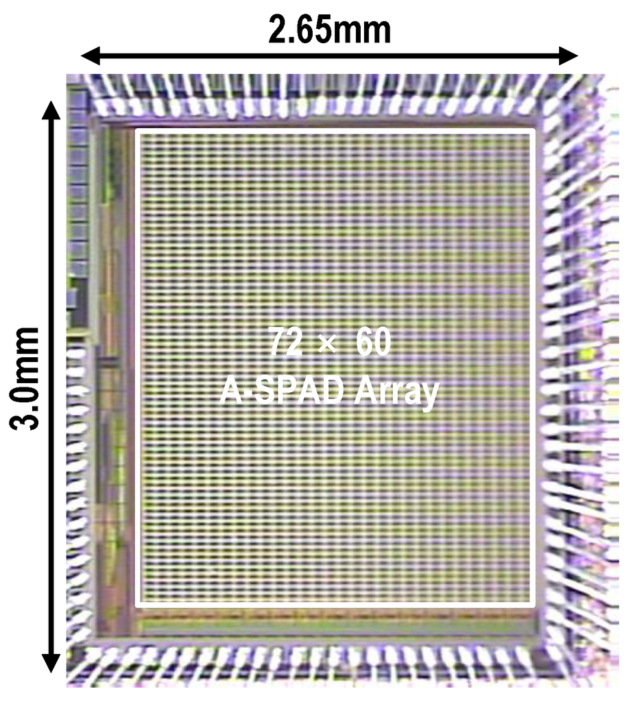 The Photon detection probability (PDP) for an A-SPAD (with Talbot and analyzer gratings) is 2.72% at 540 nm with = 1.2 V whereas SPAD without gratings resulted in PDP of 18.7 % indicating a factor of 7 loss due to the reflection from gratings [22]. The array wide (72 × 60 pixels) median dark count rate across the array was 404 Hz [22]. Including local the comparator and the 10 bit ripple counter, the pixel pitch is 35 µm × 35 µm. The chip achieves a fill-factor of 14.4% across the active area of the array, and 9.6% including support circuits and pads. The system consumes 73.8 mW or 83.8 mW power in dark or tested illumination conditions respectively.