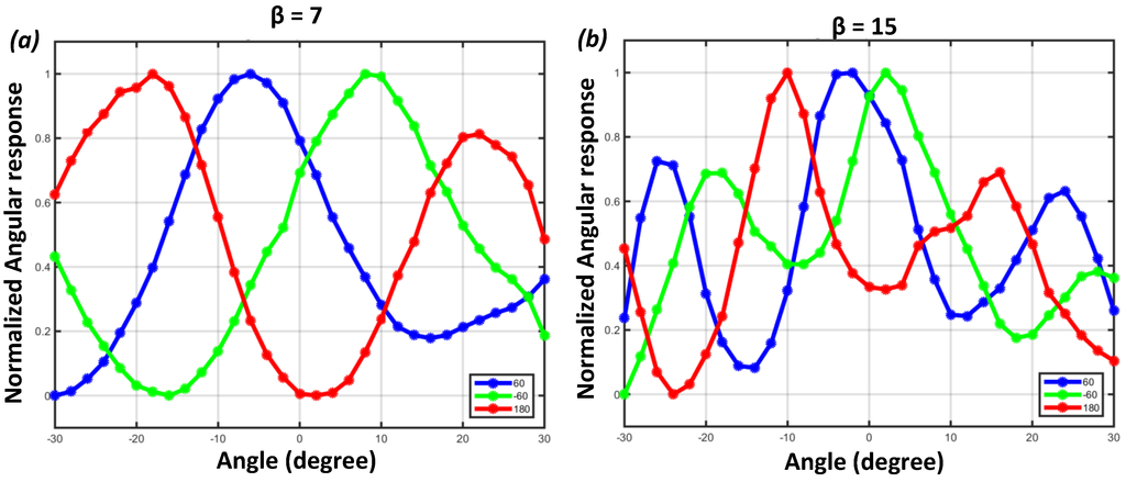 A-SPAD’s response to change in incident angle (θ, φ) was measured by rotating the sensor surface relative to a collimated beam of light generated by green LED (λ = 540 nm). Figure 11 shows measured angle response curves for all six A-SPAD pixel types. Again, this is a combination of three different phases () and two spatial frequencies () where in Figure 11a refers to low frequency (sparse grating) and in Figure 11b refers to high frequency (dense grating) pixels. The agreement between measurement (accumulation of single/few photon measurements) and simulation in Figure 2 where binary SPAD readout represents particle-like behavior of light and the FDTD simulation represents wave-like behavior of light complies with the particle/wave duality of light and verifies that A-SPAD is capable of detecting angle dimensions, making its sensing dimension a total of 5: X, Y, φ, θ, and time [22].