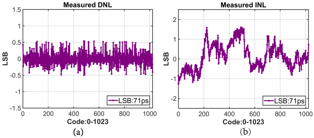 Static performance was measured for each of the three global DTCs. They were independently provided with a 20 MHz external reference clock (equivalent to highest laser repetition rate), and the delay between input reference and DTC output was measured with a 350 MHz Universal Counter/Timer (Agilent 53230A, Agilent Technologies, Santa Clara, CA, USA ). The outputs of the DTC were connected to test mode I/O pads to characterize the linearity (integral nonlinearity (INL) and differential nonlinearity (DNL)). Ten measurements were collected and averaged for each delay code. The LSB delay can be adjusted by controlling the tail current of the XOR delay unit shown in Figure 7. The change of voltage swing of the current mode logic (CML) due to change in tail current was compensated by an off-chip voltage regulator [40] and pFET load. The CML voltage swing was set to 1.6V minimize jitter and the LSB delay to 72 ps. Figure 12a,b show the resulting DNL and INL of the DTC. The maximum measured DNL is less than 0.54 LSB, and INL is less than 1.27 LSB. The measured high jump around the MSB switch of INL is similar to our layout extracted simulation results, which implies that this abruptness may have been caused by the parasitic capacitance in layout routing. The root-mean-square (RMS) jitter averaged over the full dynamic range was 13.2 ps, and power consumption was 24.1 mW with 1.8 V supply voltage.