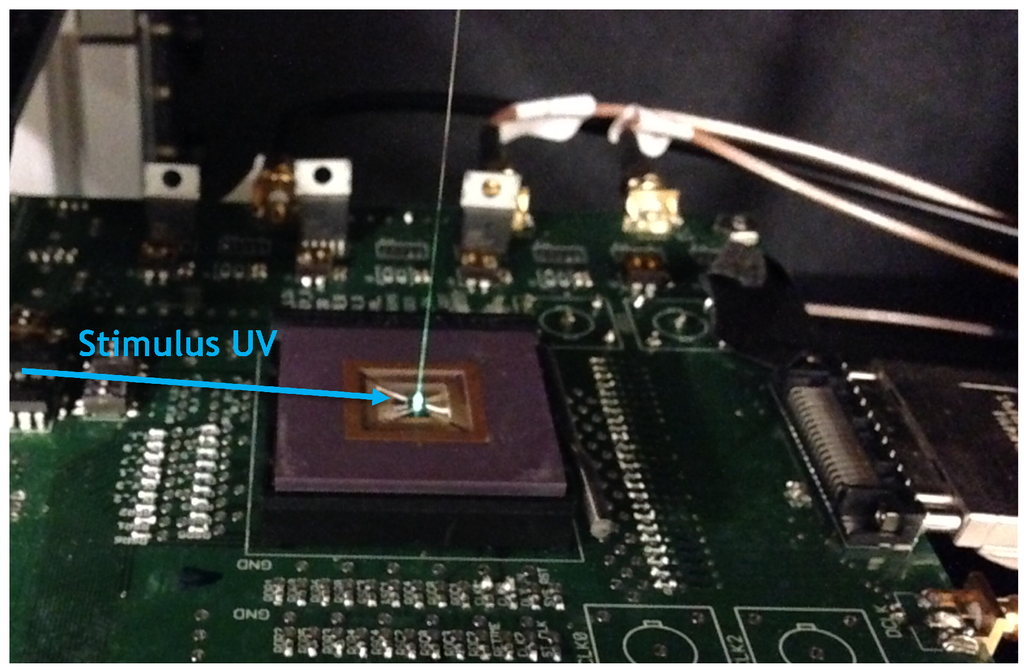Figure 10 shows the micro-photograph of the A-SPAD FLIM integrated circuit (IC), fabricated in a standard 180 nm CMOS process. The IC was interfaced with a field-programmable gate array (FPGA) (Cyclone II, Altera, San Jose, CA, USA) for serial peripheral interface (SPI) control, and 20 low-voltage differential signaling (LVDS) (2 × 10 bit) output channels were connected to a high speed digital data acquisition module (NI PXIe-6555, National Instruments, Austin, TX, USA). The lifetime histogram and image reconstruction were post-processed in MATLAB.