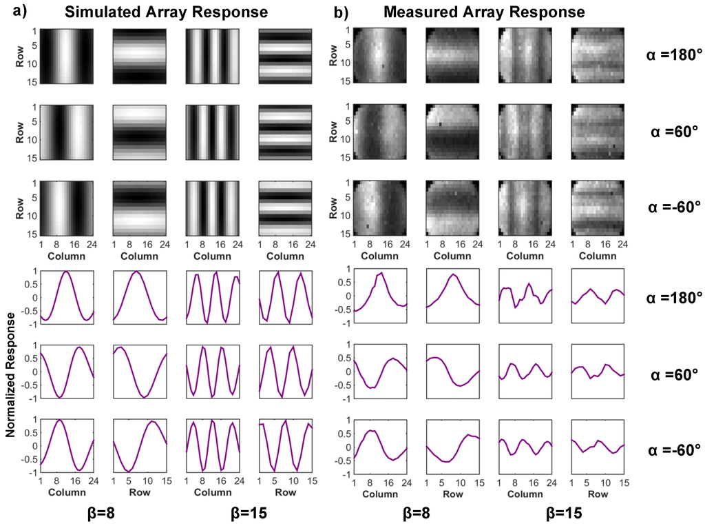 Prior to performing 3D localization, the array-wide angular response to a point light source was verified. This response was first computed considering the total 12 configuration (six pixel types in X-Y alignment. See Figure 8) per tile of the A-SPAD array. To measure the actual response, an LED light passing through a pinhole was placed far away from the array to generate a beam from a point light source. This beam was passed through a high aperture lens placed on top of the array so that the resulting light spread would look like it originated from a point source. To extract an angular response, average intensity data of three different phase samplings, is subtracted from each individual pixel response. Figure 14 shows the comparison between computed and measured angular response of the array.