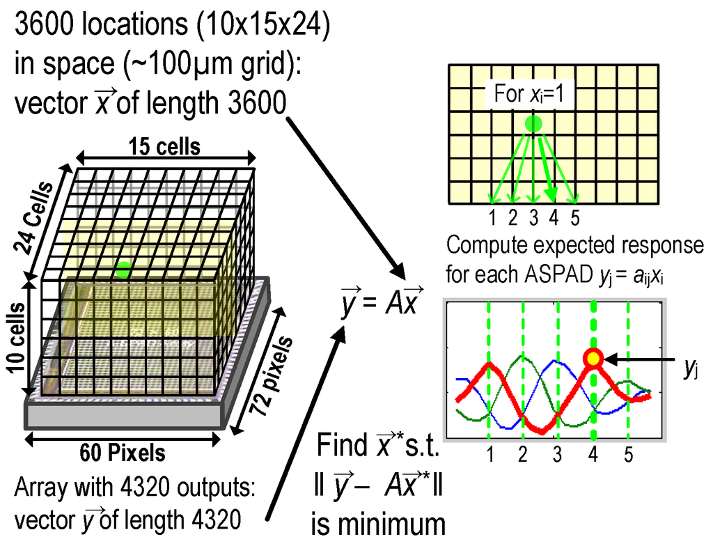 Compared to lensed systems, the proposed system here suffers from reduced lateral resolution: a lensed system is limited to a lateral resolution set by pixel size and magnification, and or by the diffraction limit of the light itself (100s of nm). The lensless approach described here, does not benefit from magnification, and so for objects close to the chip is limited by the pixel pitch itself (35 µm). For more distant objects, this resolution is limited by the effective angular resolution of the A-SPADS, which is, in the angle domain, and translates to in the spatial domain, where z is the vertical distance from the chip to the plane being resolved. Vertical resolution is this same term, scaled by the cosine of the angular aperture () of the A-SPADs: . Compared to a typical lensless contact imager, this resolution is improved by a factor of . Thus, resolution wise, the proposed approach falls between full, high resolution lensed systems, and typical lens-less systems. While a quantitative study to analyze key metrics of the reconstruction such as spatial resolution, estimation error, robustness, convergence rate, effect of scattering, number of sources and computational overhead in a greater detail is certainly needed to better understand the system and such performance parameter is inevitably a strong function of algorithms which of details will merit a paper of its own [41].