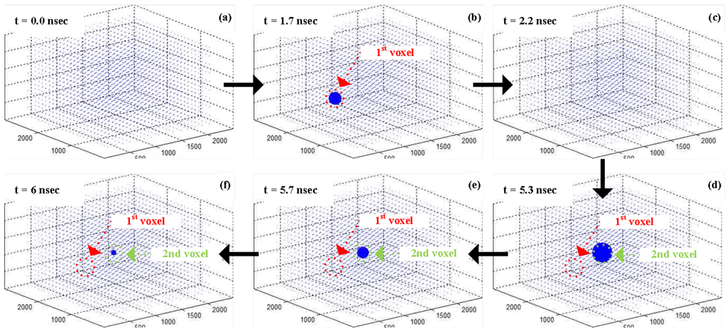 For this measurement, a 10 ns wide time-gate was shifted in steps of 139 ps, corresponding to two LSB bits of DTC, with 3D localization performed for each time step. The distinctive lifetimes of the two fluorophores—Muscimol Bodipy TMR-X (red) and Fluoresbrite YG (green)—make the solution sparser and easier to reconstruct. The reconstructed peak location for each shifted time-gate are shown in Figure 16. The distinct temporal responses of the two voxels whose response was above threshold reconstruction correspond to each lifetime of the two fluorophores. The global sensitivity which is a function of the SPAD reverse bias was adjusted to meet the SNR requirements to localize the Muscimol Bodipy TMR-X conjugate (Red voxel) due to the poor absorption efficiency at single photon excitation wavelength (385 nm). As a result, the laser power and the array sensitivity was excessive for the Fluoresbrite YG microspheres (Green voxel), resulting in partially saturated response from many SPADs avalanching at once due to photons from the Fluoresbrite YG. This can be alleviated by simply adding an additional excitation source where each of fluorophore types can be more efficiently stimulated. Nevertheless, even with single excitation source a 3D location of two distinct fluorophore voxels are accurately reconstructed as shown in Figure 17.