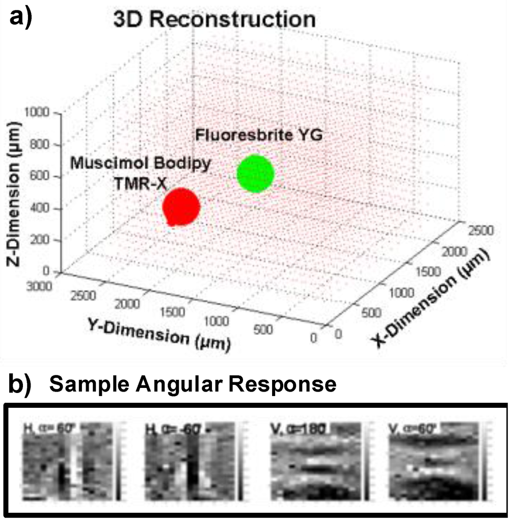 (a) 3D localization of two types of fluorophore micro-spheres. (b) Sample angular response from these micro-spheres.