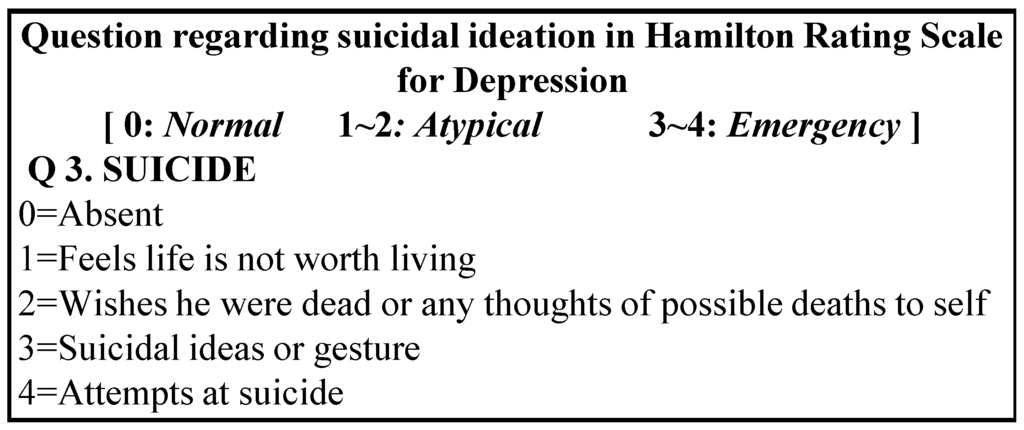 Emergency psychiatry deals with psychiatric emergencies, which are acute disturbances of behavior, thought and mood in mentally-disordered patients, who are at risk of potential danger to themselves (e.g., suicide) and to others (e.g., homicide) [13]. However, this research is focused only on the suicidal psychiatric emergency due to the unavailability and unobtainability of datasets of the homicide psychiatric emergency. The higher severity levels of stress, depression, hopelessness, aggressiveness and anxiety are the most influential features of a psychiatric emergency as presented in the clinical model of suicidal behavior [14]. Thus, different psychiatric scales, such as the Beck Depression Inventory (BDI) [10] and the Beck Hopelessness Scale (BHS) [15], are used to measure the severity levels of potential triggers for an emergency psychiatric state. However, those scales are insufficient for real-time and continuous assessment of the putative risk factors of an emergency psychiatric state. Therefore, in this research, the non-invasive and wearable biosensor signals are analyzed by utilizing an AAL framework to predict the emergency psychiatric state. Therefore, the psychiatric states are defined objectively as Normal (N), Atypical (A) and Emergency (E), based on Question Number 3 of the Hamilton Rating Scale for Depression (HRSD) [11], as presented in Figure 1.