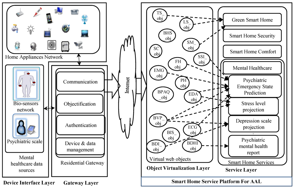 Moreover, the traditional Service-Oriented Architecture (SOA) [7], which ignores the layered design approach, is proven to be too heavyweight for the resource constraints of a smart home environment to enable AAL service. Therefore, this paper proposes an AAL framework based on a Web of Objects (WoO) [8,9], especially for the mental healthcare scenario. Dwellers’ or patients’ major psychiatric symptoms are monitored through home-based lightweight biosensors and web-based psychiatric rating scales (e.g., the Beck Depression Inventory (BDI) [10], the Hamilton Rating Scale for Depression (HRSD) [11]). The biosensor observations and psychiatric rating scores are used to assess the dweller’s mental health status and thus to predict an emergency psychiatric state.