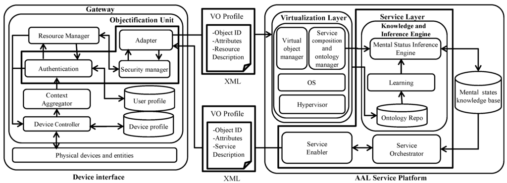 The gateway layer bridges the AAL service platform and device interfaces. The core objective of this module is to provide device management, user profile and device profile management along with web connectivity to all of the devices. In addition, the gateway aggregates the environmental data generated by the heterogeneous consumer devices and sensors, which are disseminated as a web of objects (i.e., XML) for processing afterwards in the virtualization layer, as presented in Figure 4.