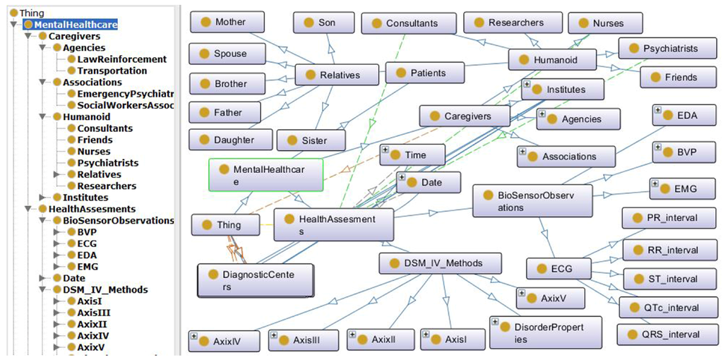 The objectified physical devices and entities are virtualized in this layer to simplify the object collaboration for service creation. Consequently, this procedure also enables the devices to be identified and actuated through their own device profile, method and control information. In fact, all of the virtual objects maintain a semantic relationship with each other. The mental healthcare semantic ontology [32] is developed and presented in Figure 5 for emergency psychiatric service creation. The developed psychiatric ontology is based on the Diagnostic and Statistical Manual of Mental Disorders IV, Text Revision (DSM-IVTR) [33].