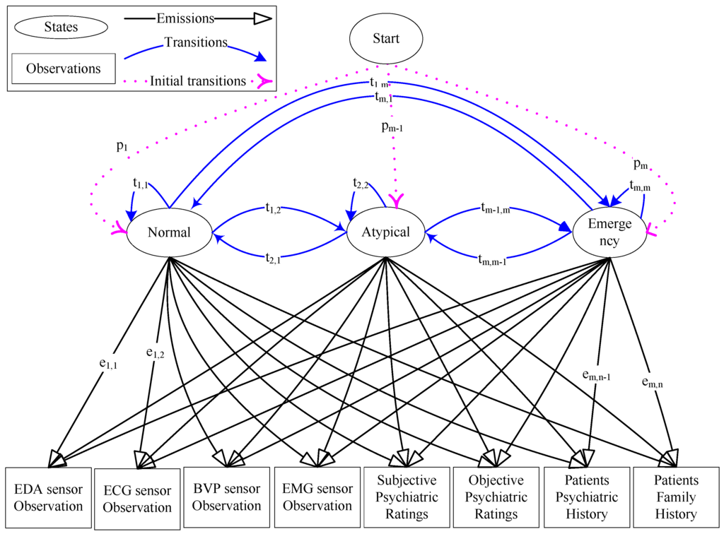 The psychiatric states are considered as hidden or latent variables to model the emergency psychiatric states, because these states are not fully or partially observable. The hidden states can be predicted through some biosensor observations, psychiatric screening scores, individual psychiatric records and family histories. The future psychiatric mental state of a patient is dependent exclusively on the current state. Thus, the HMM [34,35] is barely apposite to model the psychiatric states of individuals.