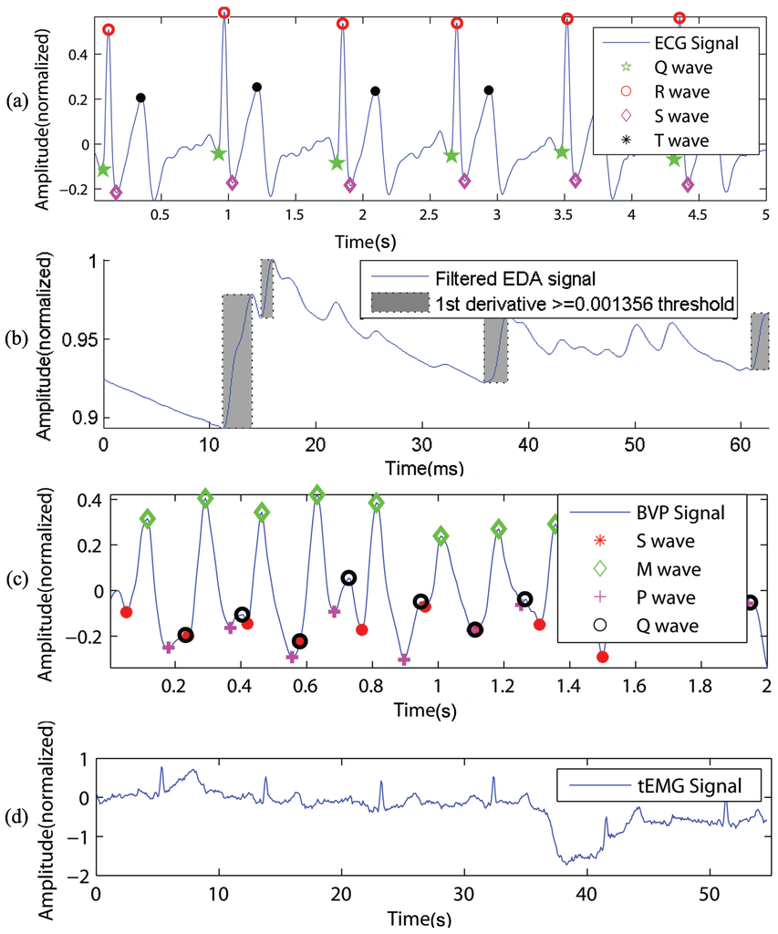 Preprocessed and extracted feature of (a) ECG; (b) EDA; (c) BVP and (d) EMG sensors.