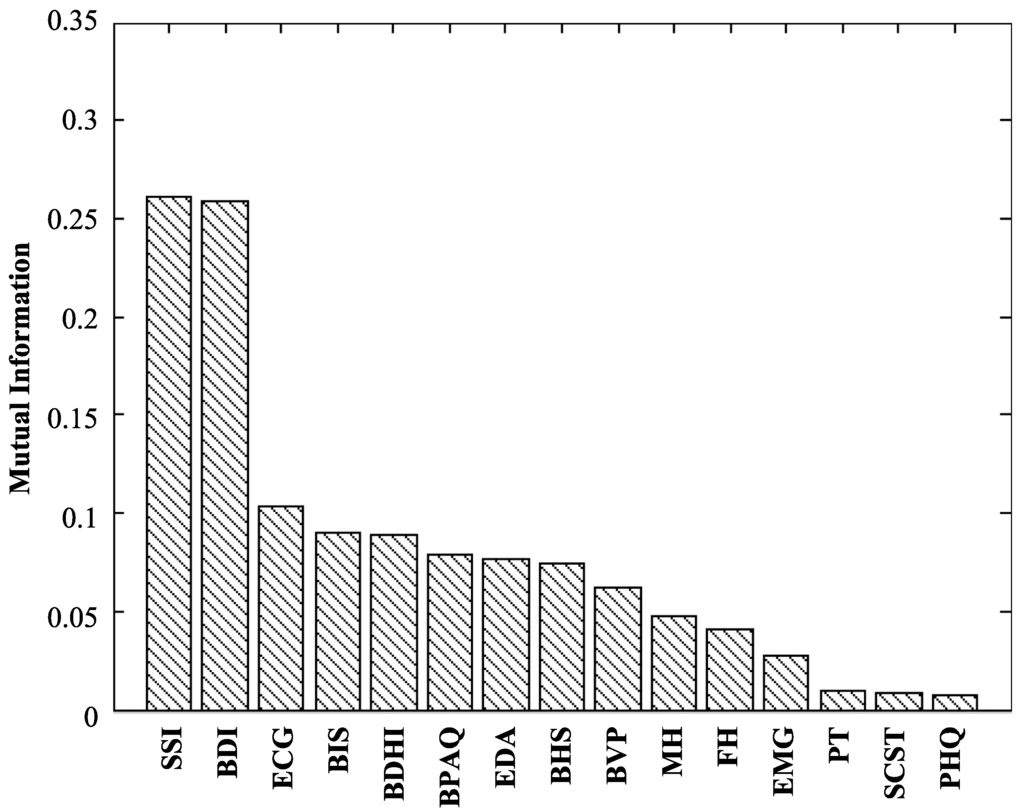The observed psychiatric rating scores were quantified based on the benchmark psychiatric scales. Furthermore, the feature values are normalized through the min-max normalization [46] method. However, the minimal-Redundancy-Maximal-Relevance (mRMR) [47] feature selection method was applied to select a compact discriminating feature set based on the statistical dependency of features on emergency, atypical and normal psychiatric states. Figure 8 shows the 15 superior feature groups with higher mutual information based on mRMR, where it shows SSI, BDI and ECG features as the higher discriminating feature groups. Therefore, the features with a mutual information value of zero are discarded as non-discriminating futures to build up the compact candidate feature set.