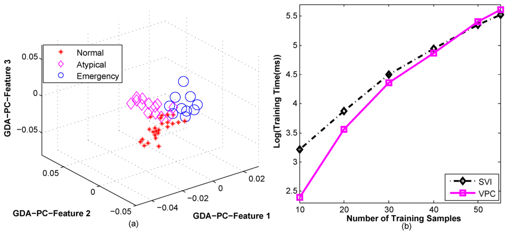 (a) Plotting of GDA-PC features of three types of psychiatric state class using HMM as a classifier; and (b) comparison of training times between VPC- and SVI-based HMM training.