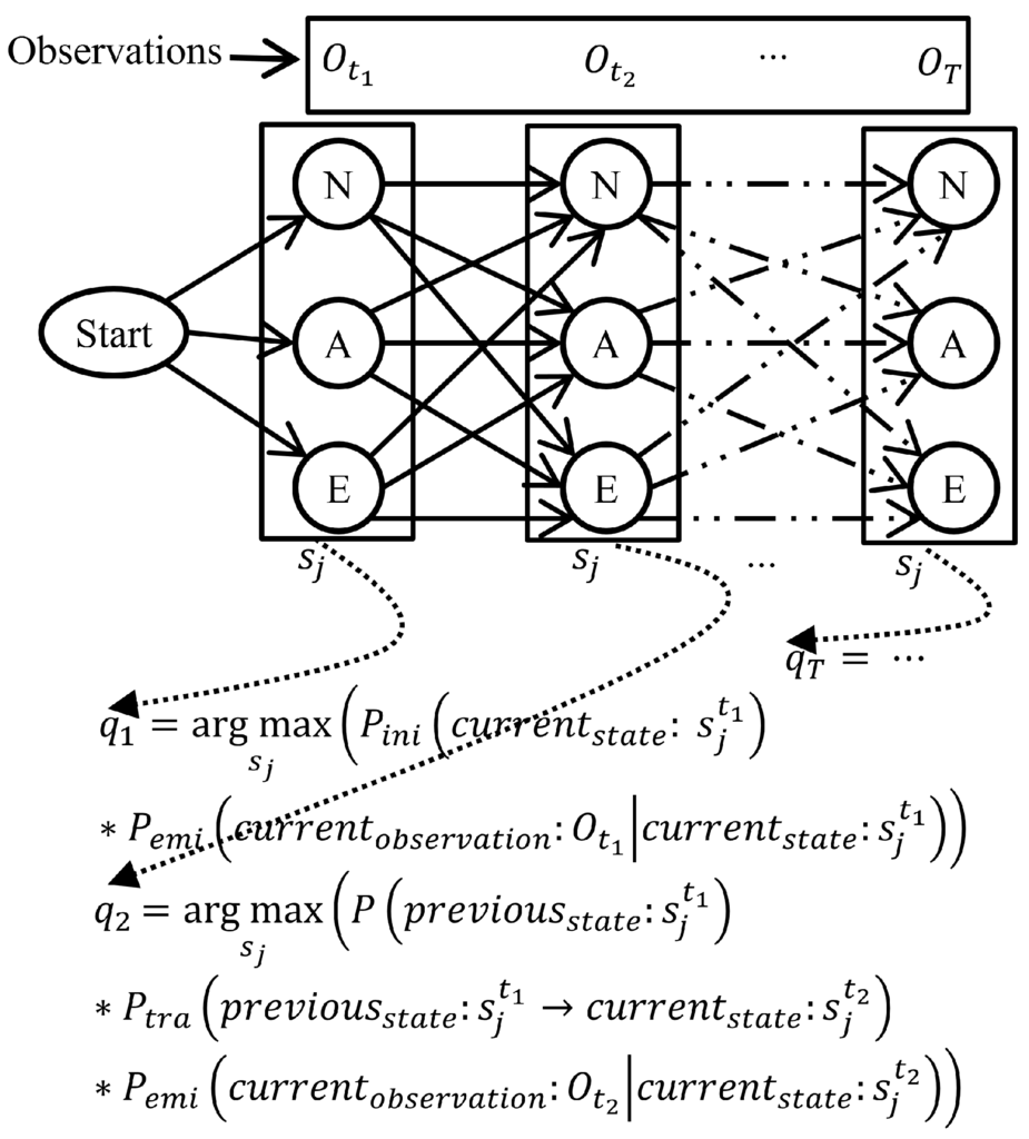 The feature values (or observations) of bio-signals along with the supporting features of the complete feature vector contributed to predicting the psychiatric state of different time slots. The initial (), transition () and emission () probabilities of trained HMM were used in predicting the psychiatric state of time slot for observation . Figure 10 shows the trails of predicting state sequence {, , …, } from the observation sequence {, , …, } of different time slots through (1), where normal, atypical and emergency states were represented as N, A and E, respectively. Therefore, the Viterbi algorithm determined the most likely state sequence {, , …, } based on the perceived observation sequence {, , …, } as presented in Step 1 of Algorithm 1 and in Row 1 of Table 1.
