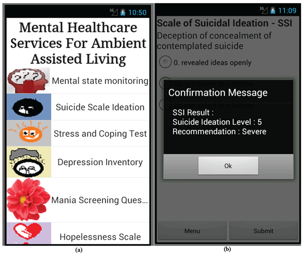 The prototype implementation of AAL framework: (a) Enabled mental healthcare services through the AAL framework; and (b) Evaluation result of benchmark Scale of Suicide Ideation (SSI) [30].