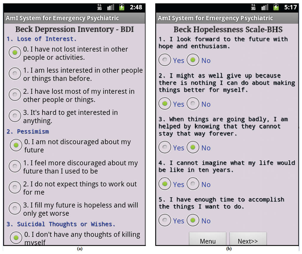 The benchmark questionnaire prototype: (a) Beck Depression Inventory (BDI) [10]; and (b) Beck Hopelessness Scale (BHS) [15].