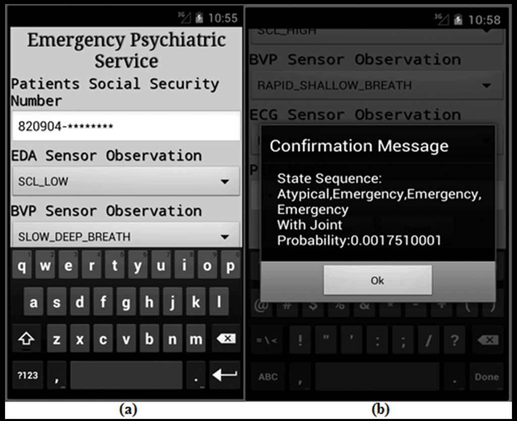 - Emergency psychiatric state prediction: Decoding the psychiatric state of a patient through indirect channels of non-invasive biosensors is challenging. The discriminative features of putative risk factors for emergency psychiatric states are extracted from biosensor observations. For structured prediction, the emergency psychiatric states are modeled through an HMM. The psychophysiological features along with the psychometric features and patient histories are used as the observations to predict psychiatric state. Additionally, an emergency psychiatric state prediction algorithm is proposed for inferring the risk of psychiatric emergency. The probabilistic model parameters are estimated, and the accuracy of the model is validated over a training and testing dataset. The prototype is developed and tested.