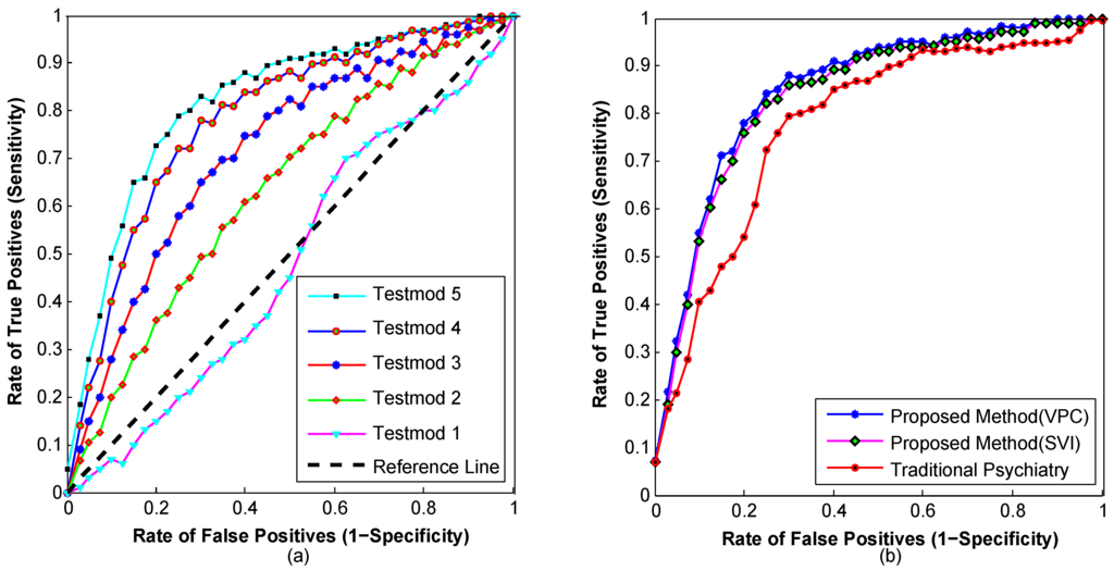 Subsequently, Principal Component Analysis (PCA) [48] was performed for further dimension reduction in the transformed domain. Therefore, the individual contribution of signal features for psychiatric state prediction become indistinctive because of the transformed feature domain. In fact, PCA is a prominent subspace projection method that is widely used for reducing the dimension space from a higher dimension, as well as for maintaining the high order relationship. Afterwards, the Generalized Discriminant Analysis (GDA) [49] was applied on the Principal Component (PC) feature vectors for concentrating more closely the features of the same psychiatric state classes. The PCA and GDA dimension reduction methods are discussed elaborately in the previous studies [48,49]. However, Figure 9a shows the classification of psychiatric states based on the first three GDA PC features, where HMM is used as a classifier.