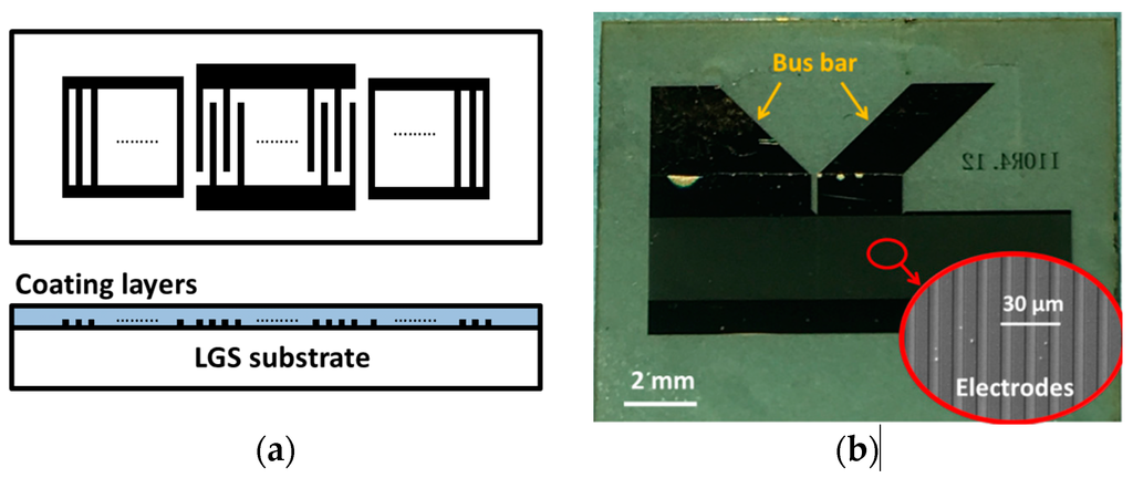Figure 1. (a) Schematic illustration of one-port surface acoustic wave (SAW) resonator. The upper one is the top view and the lower one is the sectional view. LGS: langasite. (b) Photo of the prepared SAW resonator. Inset: SEM photo of the electrodes.
