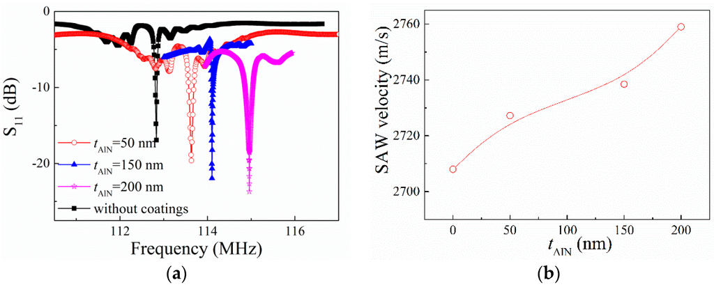where fr is the resonance frequency of the SAW device obtained from the S11 curve. The calculated SAW velocities as a function of tAlN are shown in Figure 2b. We can find that the SAW velocities increase with increasing tAlN. This is due to AlN guiding layers offering higher acoustic wave velocity (about 5100–5600 m/s [12,13]) than the LGS substrate (about 2700 m/s [14]). More acoustic wave energy will be concentrated in the guiding layers with increasing tAlN.