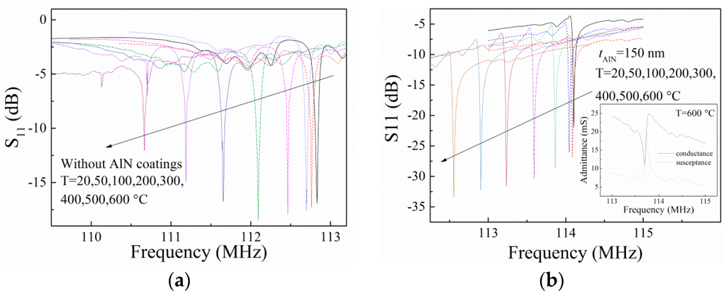 The SAW devices without and with AlN coatings were measured from room temperature to 600 °C, and the S11 results of the SAW devices are shown in Figure 3. It can be found that the sharp resonance peak still exists at 600 °C, indicating that both of the SAW devices can work up to 600 °C. We also found that the resonance frequency decreases with increasing temperature. It can be interpreted as that both the LGS substrate and the AlN coating layer have a negative temperature coefficient of SAW velocity [14,15], which results in a decrease of the fr of the SAW devices with increasing temperature. From Figure 3a,b, it can be observed that the height of the resonance peak of the SAW device without AlN coatings decreases at high temperature, while that of devices with AlN coatings do not attenuate at high temperature. This result suggests that the SAW device is indeed protected by the AlN coating layer at high temperature. With the measured S11 curve, the admittance (conductance and susceptance) of the SAW devices can be calculated, which is shown in the inset of Figure 3b. The admittance will next be used to calculate the electromechanical coupling coefficient (K2).