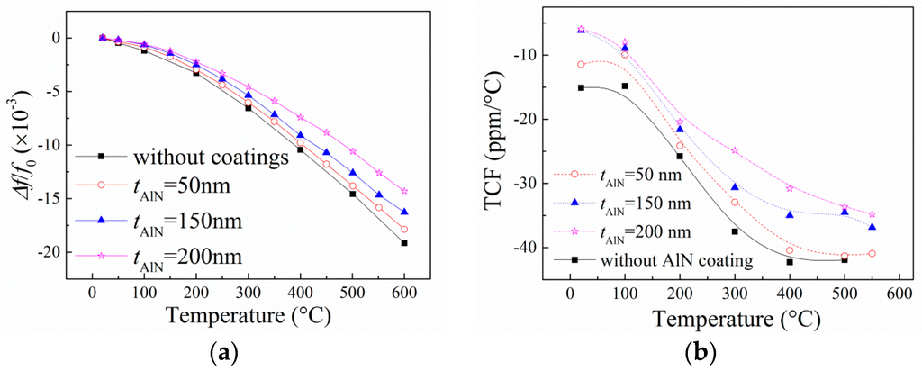 where fT and f0 are the resonance frequency of the SAW devices at temperature T and room temperature, respectively. The Δf/f0 for the SAW devices with different thickness of AlN coating layers as a function of temperature is presented in Figure 4a. It can be observed that the Δf/f0 is dependent on the AlN film thickness. The absolute value of Δf/f0 decreases with increasing AlN film thickness at the same temperature.