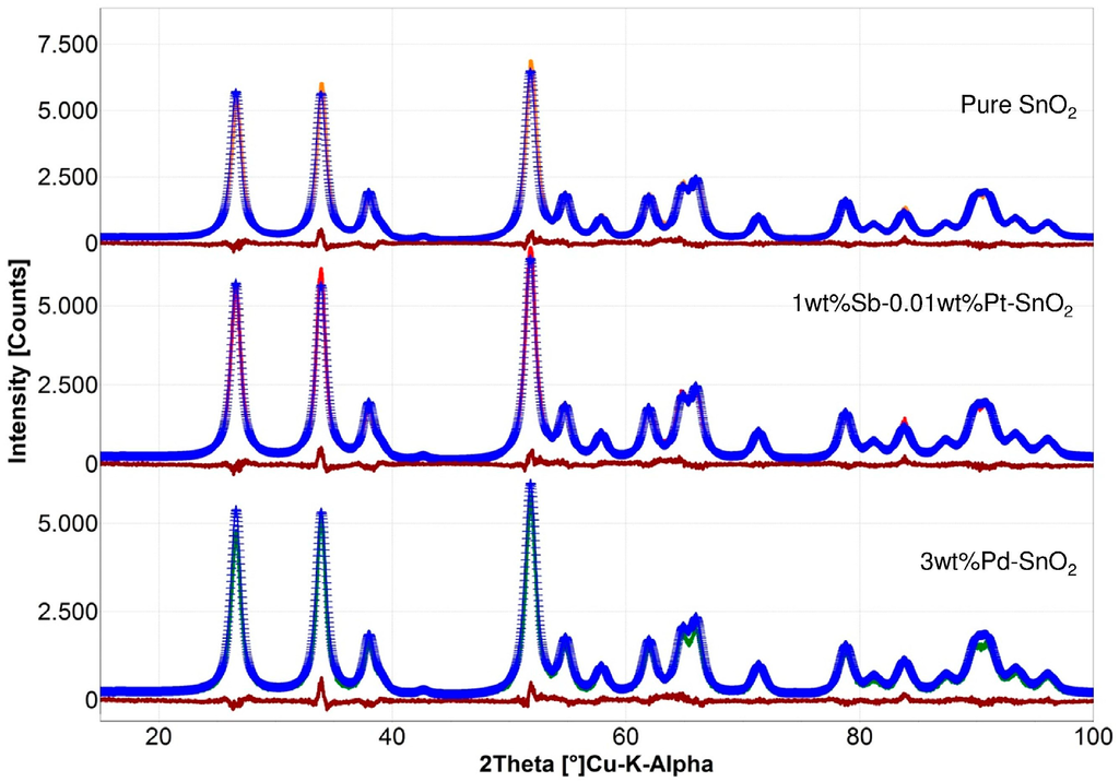 The Rietveld analysis of the XRD patterns of pure SnO2 (upper panel), 1 wt % Sb–0.01 wt % Pt-SnO2//3 wt % Pd-SnO2 (middle panel) and 3 wt % Pd-SnO2 (lower panel).