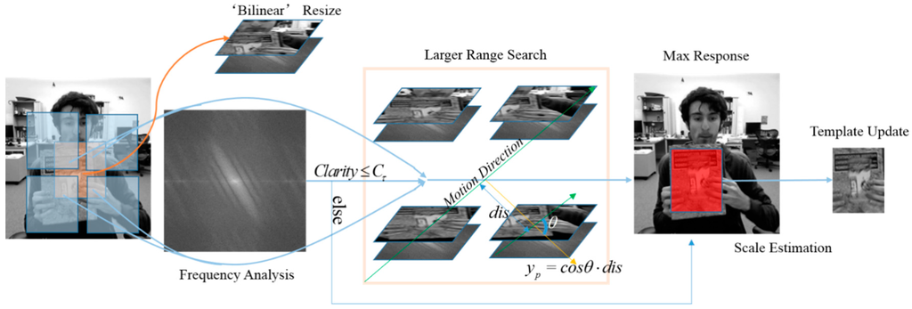 where cl and ch respectively denote the mean value of low and high clarity values. When the clarity value exceeds the adaptive threshold cτ, calculated by Equation (17), it indicates that the target tends to be blur free or slightly blurred. Hence, the maximum response is calculated for template in the original range and output the target position for next coming frame. Otherwise, the search range is enlarged according to the blur extent by a shifting L above, below, to the right and to the left in the current frame. Here we have: